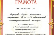 3 место в Республиканской олимпиаде среди студентов ССУЗ РТ по специальности «Экономика и бухгалтерский учет» заняла Морозова Дарья, студентка 3 курса ГАОУ СПО «Тетюшский сельскохозяйственный техникум».