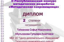 С целью выявления лучших педагогических практик и инновационных методик работы педагогов дополнительного образования Республики Татарстан Муниципальным бюджетным учреждением дополнительного образования «Центр детско-юношеского творчества» Управления образования Альметьевского муниципального района был организован II Республиканский конкурс методических разработок «Методическая сокровищница» в котором приняли участие педагоги «Центра дополнительного образования» художественной направленности – Тайманова С.Н. и Абульханова Г.А. По итогам конкурса они награждены Дипломом II степени в номинации «Сценарий игрового (развлекательного) мероприятия».