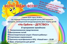 1 июня 2016 года в 10.00 ч. на стадионе Тетюшской средней школы №2 состоится праздник, посвященный международному Дню защиты детей «На Орбите – ДЕТСТВО!»