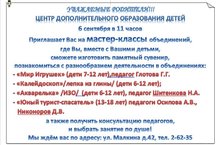 Уважаемые родители! Центр дополнительного образования детей приглашает Вас 6 сентября в 11 часов на мастер-классы объединений, где Вы, вместе с Вашими детьми, сможете изготовить памятный сувенир, познакомиться с разнообразием деятельности в объединениях.