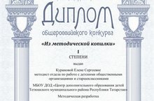 Победителем общероссийского конкурса «Из методической копилки» в номинации «методические разработки» стала Куранова Елена Сергеевна, методист отдела о работе с детскими общественными организациями и старшеклассниками Центра дополнительного образования детей.