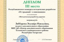 Педагог Центра дополнительного образования Зяббарова Э.Н. награждена Дипломом 3 степени Республиканского конкурса методических разработок «От традиций к инновациям». Конкурс проводился с целью стимулирования профессионального развития педагогов, внедрения и распространения инновационных практик в образовательную и воспитательную деятельность образовательных организаций, выявление и трансляция актуальных идей, лучших педагогических и методических практик работников системы дополнительного образования.