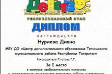 Подведены итоги Республиканского этапаXXIIМеждународного фестиваля «Детство без границ». В конкурсе изобразительного искусства и художественно-прикладного творчества «Юные чудотворцы» в номинации « Юных рук мастерство» Нуриева Диана, обучающаяся объединения «Мир игрушек» (педагог Глотова Г.Г.) Центра дополнительного образования города Тетюши награждена дипломом за 1 место. Поздравляем Диану и педагога с победой, желаем и дальше покорять вершины творчества!