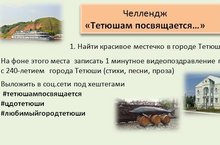 В предверии празднования 240-летия города Тетюши Центр дополнительного образования объявил челлендж «Тетюшам посвящается…» Чтобы принять участие в челлендже нужно найти красивое местечко в городе Тетюши. На фоне этого места записать одноминутное видеопоздравление горожан с 240-летием города Тетюши (стихи, песни, проза), после чего выложить в социальные сети под хештегами #тетюшампосвящается #цдотетюши #любимыйгородтетюши