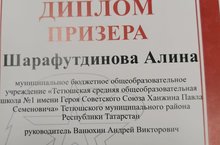 Обучающаяся 11 класса МБОУ «Тетюшская СОШ №1 им.Ханжина П.С.» Шарафутдинова А. стала призером Республиканской военно-исторической олимпиады среди юнармейцев на знание военной истории (наставник: А.В.Ванюхин). Данная олимпиада - интеллектуальное творческое мероприятие, которое проводится среди юнармейцев - обучающихся общеобразовательных организаций и организаций среднего профессионального образования Республики Татарстан. Учредителями Олимпиады выступают Министерство образования и науки Республики Татарстан, Государственное бюджетное учреждение дополнительного образования «Республиканский центр внешкольной работы», штаб Регионального отделения Всероссийского детско-юношеского военно-патриотического общественного движения «ЮНАРМИЯ».