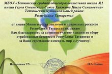 Министерство экологии и природных ресурсов Республики Татарстан выразило благодарность нашей школе за активное участие в акции по сбору отработанных батареек.