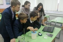 Занятие внеурочной деятельности «Экспериментарий по физике». Ребята выполняют работу по сравнению количества теплоты при смешивании воды разной температуры.