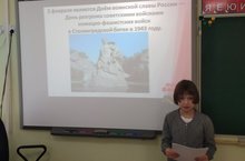 В 10б классе прошел классный час, посвященный Сталинградской битве. Обучающиеся Зубрилина О., Бехтина Д. используя доступный материал и презентацию пробудили в учащихся чувство гордости за свой народ и за прошлое свой страны в Сталинградскую битву и на протяжении всей Великой Отечественной войны.