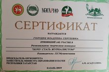 Воспитанники объединения "Юный журналист" Голудец В. и Мухаметшина Л. (рук. Л.Г.Мухаметшина) приняли участие в Региональном творческом конкурсе "Хочу стать журналистом". Учащиеся награждены сертификатами Министерства образования и науки РТ