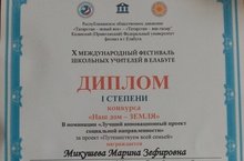 В рамках X Международного фестиваля школьных учителей в городе Елабуга Республиканское общественное движение «Татарстан – новый век» организовало конкурс «Наш дом – Земля».Дипломом I степени в номинации «Лучший инновационный проект социальной направленности» за проект «Путешествуем всей семьей» награждена Микушева Марина Зуфаровна, учитель английского языка МБОУ «Тетюшская СОШ №1 им. Ханжина П.С.», пропагандирующая идеи Хартии Земли, направленные на формирование у подрастающего поколения активной гражданской позиции, воспитание уважительного отношения к природе, универсальным правам человека, экономической справедливости и культуре мира. -