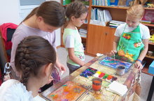 В кабинете психолога (Фирсова И.В.) работает кружок по рисованию песком и ЭБРУ. Детям очень нравятся эти виды творческой деятельности, поэтому они с большим удовольствием сюда прибегают. Песок привлекает детей своим теплом и сыпучестью. На столе с подсветкой получаются чудные и неповторимые шедевры. Многие ребята уже готовятся к участию в ежегодном международном конкурсе песочных картин. Рисование на воде – это просто волшебство перехода красок на бумагу. Всем ребятам желаем творческих успехов и замыслов в этих видах деятельности.