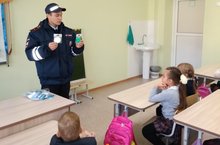 В 1 Б классе (классный руководитель Сумбаева В.И.) прошел классный час по ПДД "Ты - пешеход", на который пригласили инспектора по пропаганде БДД Волкова С.В. . Он рассказал о том, кто такой "пешеход" и какие правила они должны соблюдать. В конце беседы он подарил первоклассникам светоотражающие элементы.