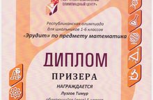 Дипломом ГАОУ «Республиканский олимпиадный центр» МО и Н РТ награжден Лузгов Т., обучающийся 5 В класса (учитель - Россеева Е.В.) - призер Республиканской очной олимпиады для школьников 1-6 классов «Эрудит» по предмету математика.