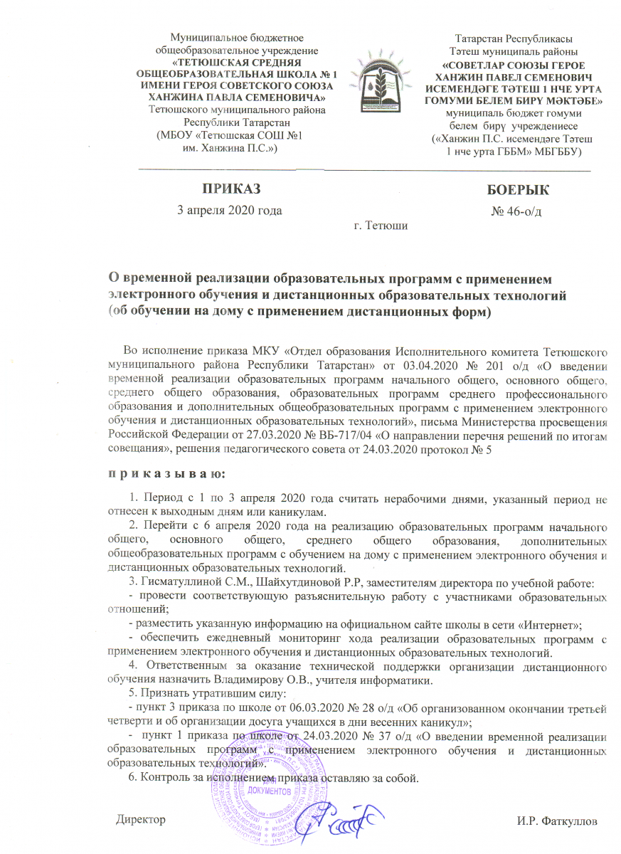 С 6 апреля 2020 года школа временно переходит на реализацию образовательных программ с применением электронного обучения и дистанционных образовательных технологий до особого распоряжения.