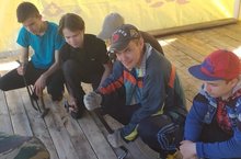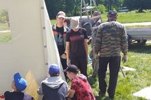 Мальчики из Трудовой бригады под руководством начальника ЛТО Похлебкина А.В. возводят шатры на территории Сабантуя.
