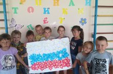 А в творческой мастерской кипела работа. Воспитанники отрядов «Огоньки» и «Ромашки» под руководством Ахтоновой Т.В.(ЦДОд) сделали аппликацию из бумажных цветов «Флаг России». В это время юные художники отряда «Весельчак» и «Клёвые дети» рисовали рисунки на тему «Я люблю тебя, Россия!»