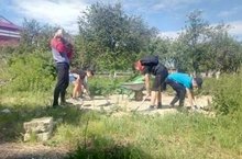 Сегодня трудовая бригада занимается благоустройством стадиона.