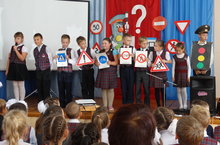 Ученики 1А класса рассказывали стихи, а в конце праздника дали торжественную клятву, что всегда будут соблюдать Правила Дорожного Движения.