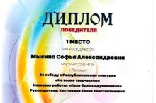 Поздравляем Мысину Софью, ученицу 3А класса, с победой в Республиканском конкурсе «На волне творчества» и ее руководителя Костюхину Елену Константиновну.