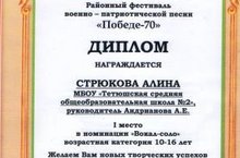 9 мая на стадионе города прошёл гала-концерт районного фестиваля военно-патриотической песни «Победе-70». Стрюкова Алина (7а класс) заняла I место в номинации «Вокал-соло» в возрастной группе 10-16 лет, ансамбль «Новый век» в составе Батталовой Руфии и Васиной Екатерины занял III место в номинации «Вокальный ансамбль»(возрастная категория 10-16 лет).