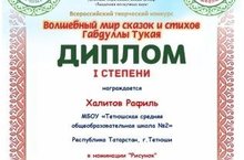 Поздравляем ученика 9 Б класса Халитова Рафиля (куратор Фаткуллова Сария Ханафиевна) с победой во Всероссийском творческом конкурсе “Волшебный мир сказок и стихов Габдуллы Тукая”. Желаем творческих успехов, новых свершений, удачи и дальнейших побед!