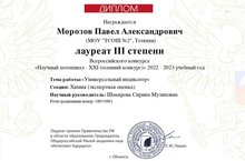 Морозов Павел принял участие во Всероссийском конкурсе исследовательских работ "Научный потенциал - XXI век". Он представил работу на тему " Универсальный рН индикатор" и был награждён Дипломом лауреата III степени. Поздравляем!!!