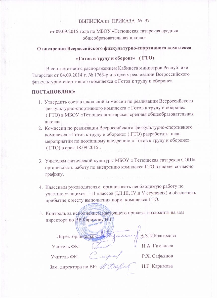 Выписка из приказа "О внедрении Всероссийского физкультурно-спортивного комплекса "Готов к труду и обороне"