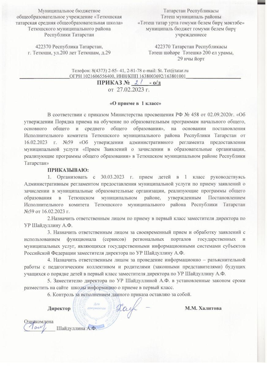 Приказ о приеме в 1 класс 2023-2024 учебного года