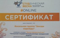 Сертификат вокальной группы ,,Звезда надежды' за участие в онлайн-конкурсе ,,Студвесна ОНЛАЙН". В конкурсе приняли участие более 700 участников. Наши курсанты представили песню ,,Жизнь - прекрасный миг", исполнив 2-х голосное пение в этом произведении. СПАСИБО вам, ребята,за труд!
