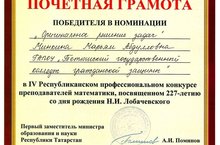 Наши преподаватели не только обучают студентов, готовят их к конкурсам, олимпиадам, к поступлению в вузы, но и сами постоянно участвуют в профессиональных конкурсах, доказывая отличное знание математики и методики её преподавания. Четвертый год в Республике Татарстан проводится Республиканском конкурс преподавателей математики, посвященный Н.И.Лобачевскому. Наши преподаватели математики являются постоянными участниками конкурса, радуя нас своими успехами и результатами конкурсов студенческих исследовательских работ с использованием математических методов.