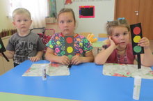Ребята создавали изображение светофора путем аппликации. Провели беседу, что означает каждый цвет. Формировали умение правильно держать ножницы, вырезание круглые формы, квадраты и аккуратно наклеивали их на силуэт светофора.