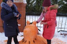 Учащиеся и учителя школы готовятся встрече нового года. Во дворе школы вылепили снежные фигуры.