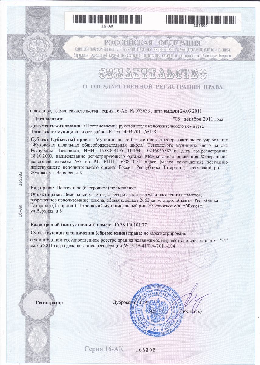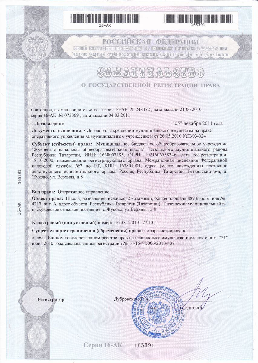 Свидетельство о государственной регистрации права. Объект права: Школа  скачать