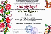 Со 2 марта по 18 апреля 2020 года в МАОУДОД «Центр детского творчества № 16 «Огниво» г. Набережные Челны состоялся открытый конкурс-выставка декоративно-прикладного творчества «Весёлая карусель». В конкурсе приняли участие воспитанники учреждений дополнительного образования детей, учащиеся общеобразовательных школ в четырех возрастных категориях: 7-8 лет; 9-10 лет; 11-12 лет; 13-14 лет, 15-16лет, от 17 лет и педагоги. Всего – 19 номинаций. В числе победителей конкурса есть ученица МБУДО «ЦВР» Тукаевского муниципального района «Малошильнинская СОШ» Тагирова Наиля. Она заняла почетное второе место.