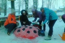 Совместными усилиями воспитателей и родителей построены снежные фигуры на участке первой младшей группы.