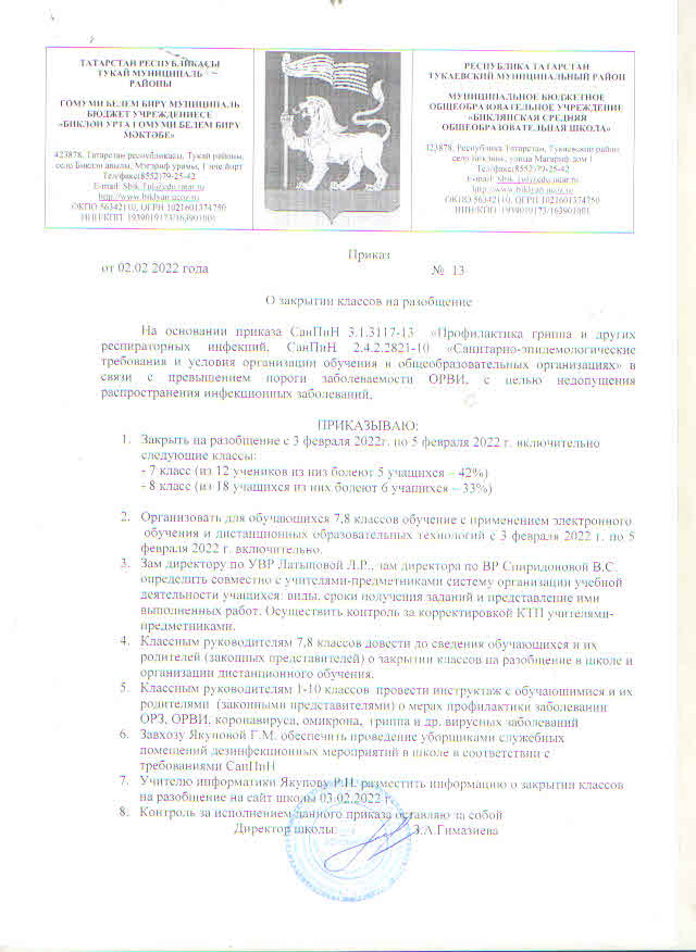 Муниципальное бюджетное общеобразовательное учреждение «Биклянская средняя общеобразовательная школа» Тукаевского муниципального района Республики Татарстан/Татарстан Республикасы Тукай муниципаль районы "Биклән урта гомуми белем бирү мәктәбе" гомуми белем муниципаль бюджет учреждениесе