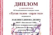 “Туган телем – серле тел” III Республикакүләм “Туган телем – серле тел” шигырь сөйләүчеләр бәйгесендә 3 нче класс укучысы Зыятдинова Г. III урын (“Милли бәйрәмнәр” номинациясе, 2-4 кл. Җитәкчесе Саитгараева Р.К), 7 нче класс укучысы Василов А. II урын (“Истәлекле урыннар” номинациясе, 7-8 кл. Җитәкчесе Сәйфуллина Г.Т.) алдылар. 11 нче класс укучысы Мәүләветдинова Д. (“Әдипләр” номинациясе, 9-11 кл. Җитәкчесе Якупова Л.Х.) “Иҗади якын килү” Дипломы белән бүләкләнде. Укучыларга киләчәктә дә зур уңышлар телибез.