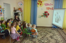 Бөек Җиңүнең 70 еллыгын каршылап.Тәрбияче Шайхулахметова Л.В.балаларны райондашларыбыз- Советлар Созы Геройлары Шарипов Нурми Халялович һәм Якупов Николай Якупович белән таныштыра. 25.03.2015