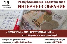 С 17 ноября 2017 года стартовал новый проект - Республиканское родительское интернет-собрание. Это совместная инициатива Министерства образования и науки Республики Татарстан и Общественного совета при Министерстве образования и науки РТ. Второе заседание родительского интернет-собрания состоится 15.12.2017 с 12.00 до 13.30, на тему "Поборы и пожертвования - что общего и в чем разница?". Вопросы принимаются по адресу roditelirt@mail.ru. Онлайн - трансляция на сайте киу.рф.