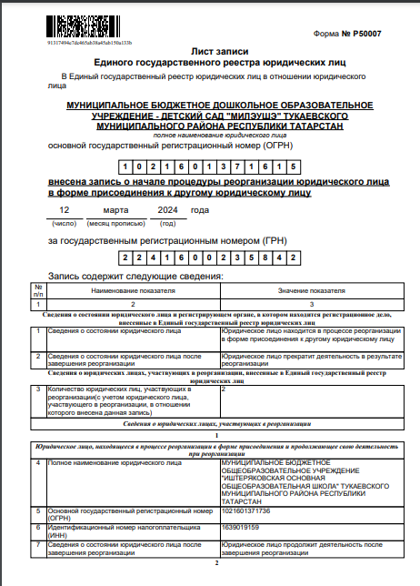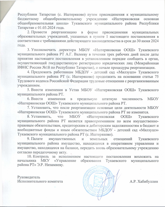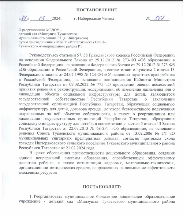 Постановление №567 от 01.03.2024 "О реорганизации МБДОУ - детский сад"Милэушэ" Тукаевского муниципального района РТ (с.Иштеряково) путем присоединения к МБОУ "Иштеряковская ООШ" Тукаевского муниципального района РТ "