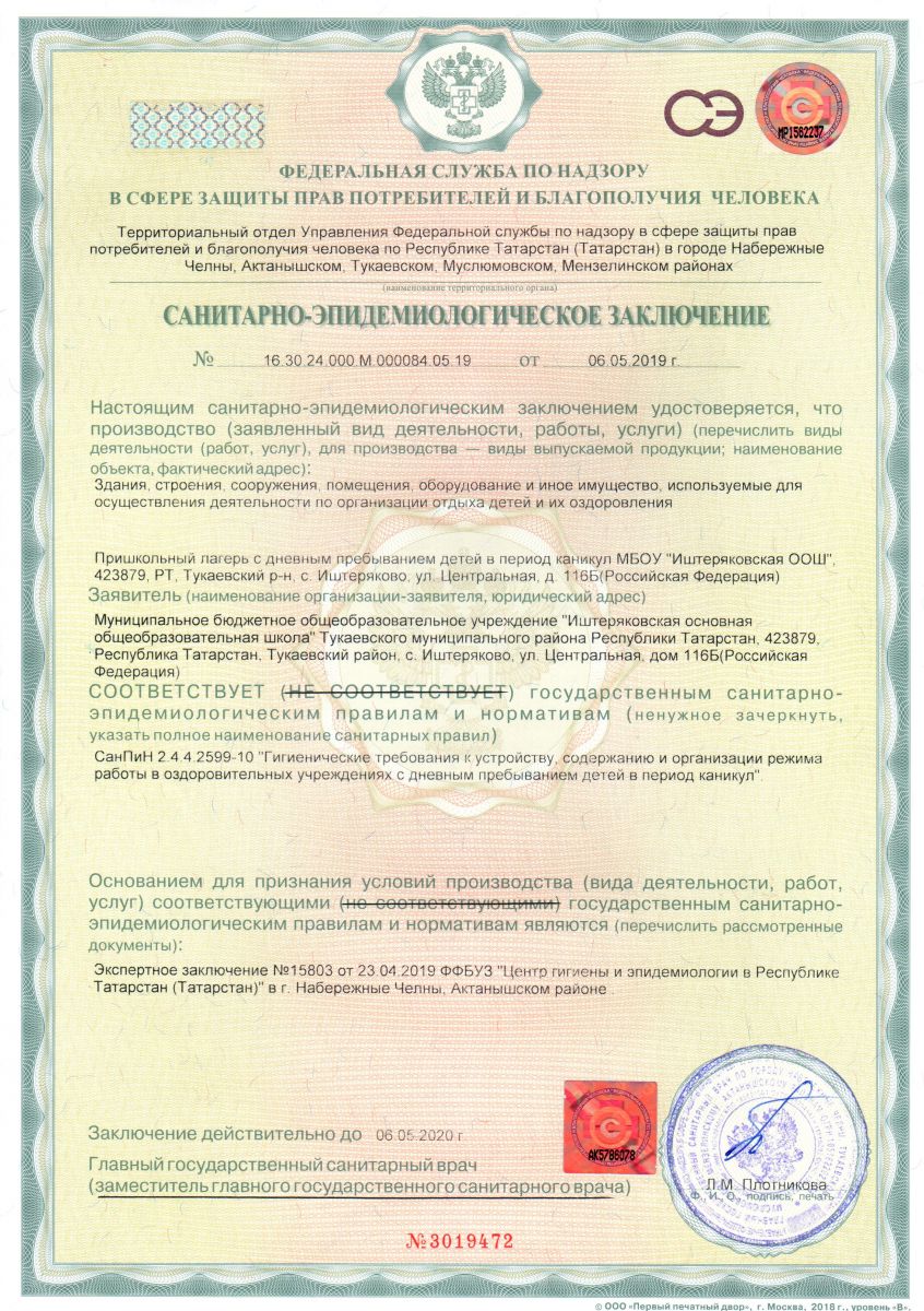 Санитарно-эпидемиологическое заключение на пришкольный лагерь