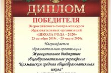 С 25 октября 2019 года по 25 марта 2020 года наша школа приняла участие во "Всероссийском смотре-конкурсе образовательных организаций "ШКОЛА-2020" и получила Диплом Победителя. Поздравляем всех учителей за работу, проделанную во время подготовки и размещения материалов на сайте конкурса.
