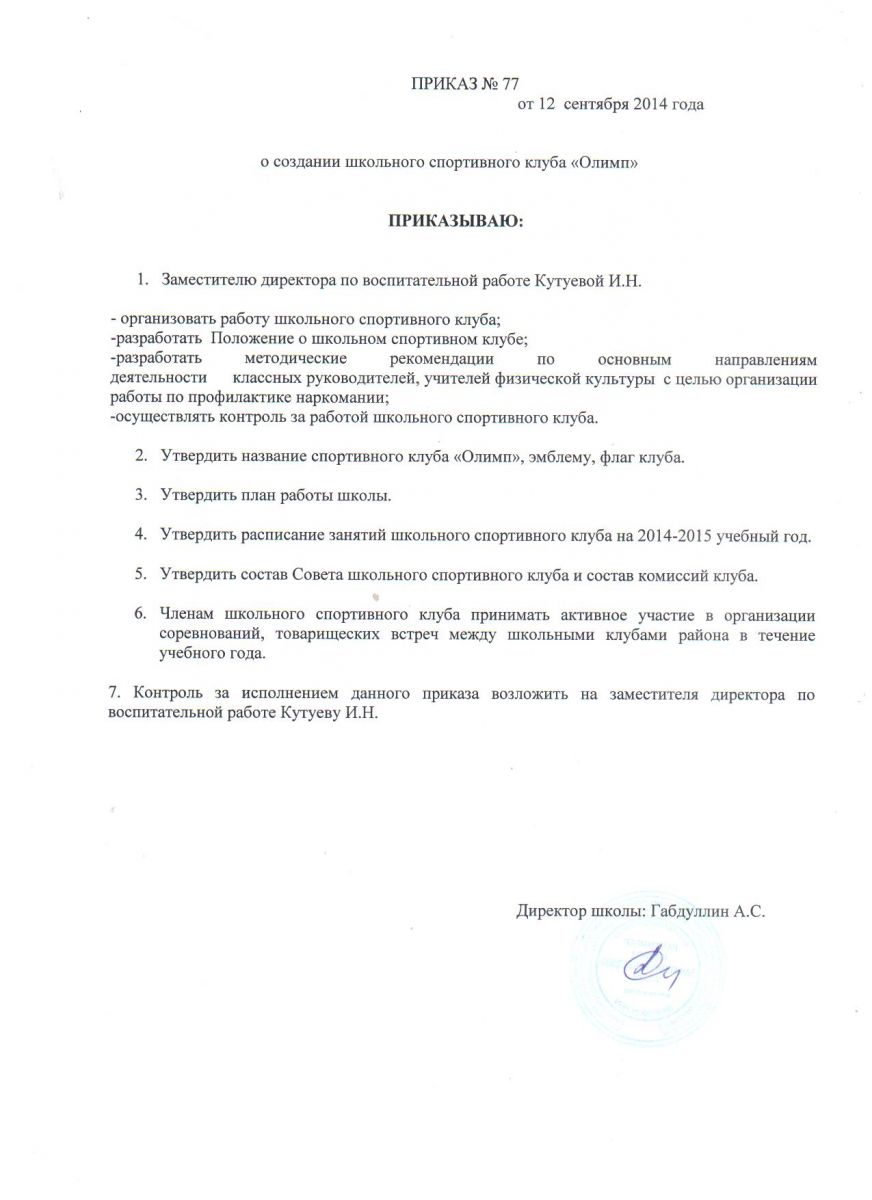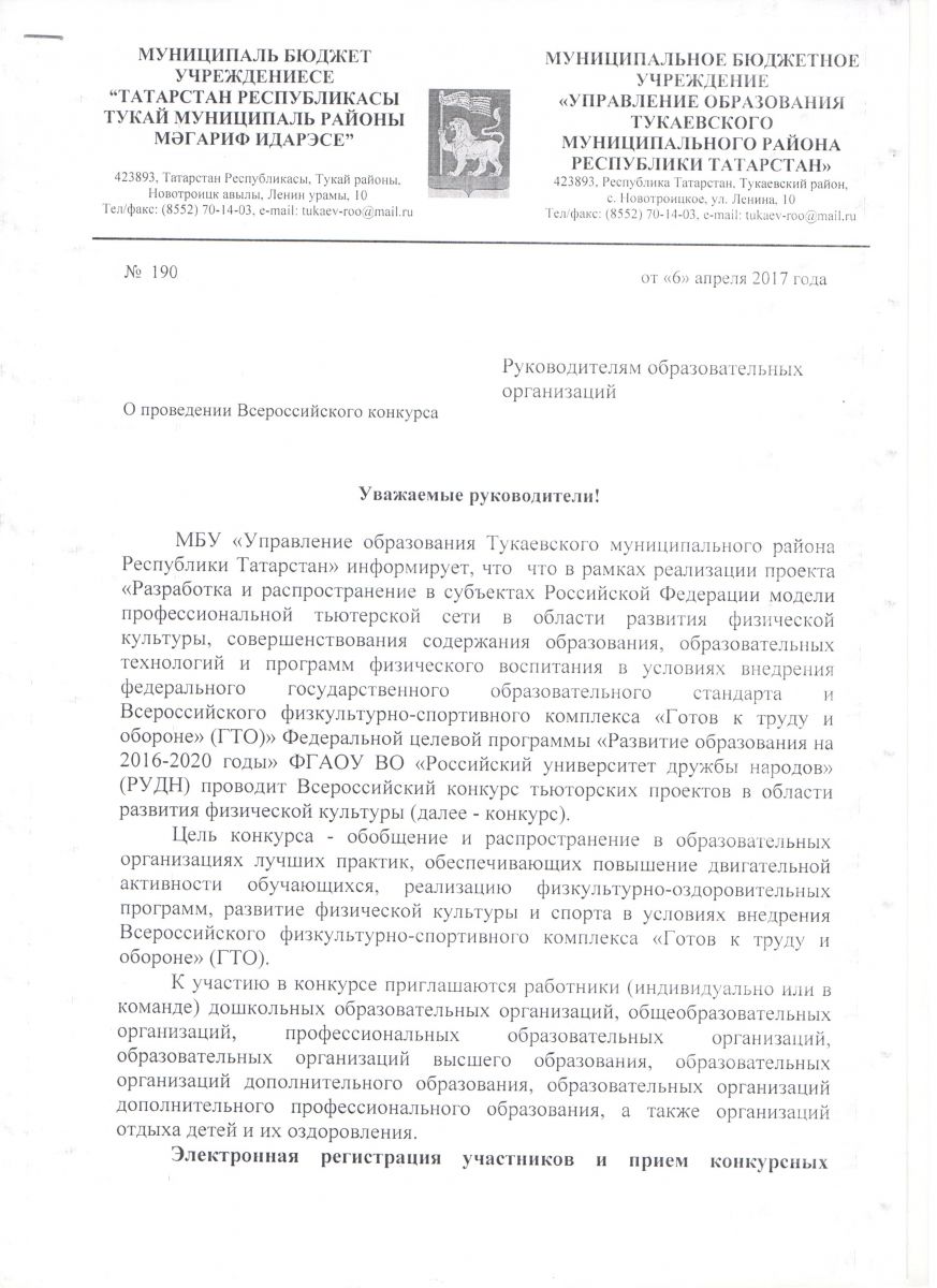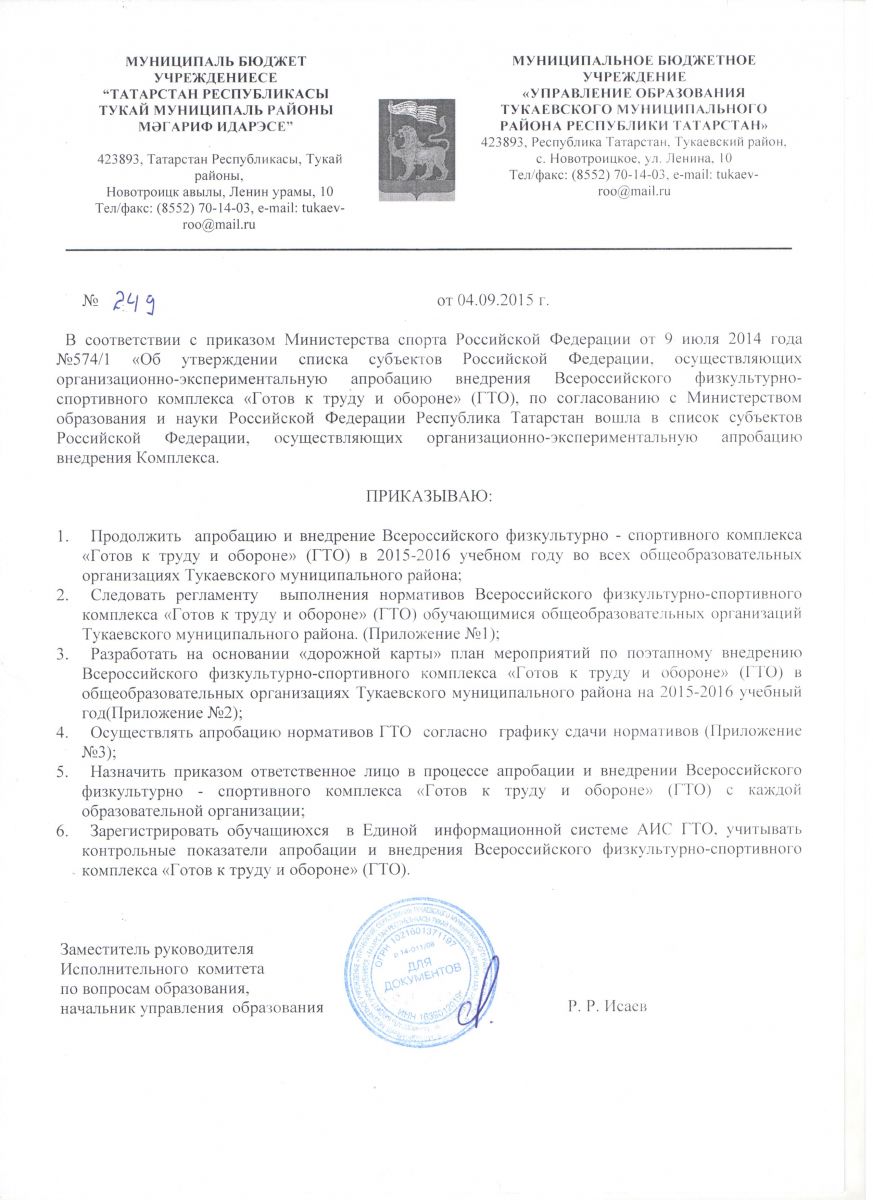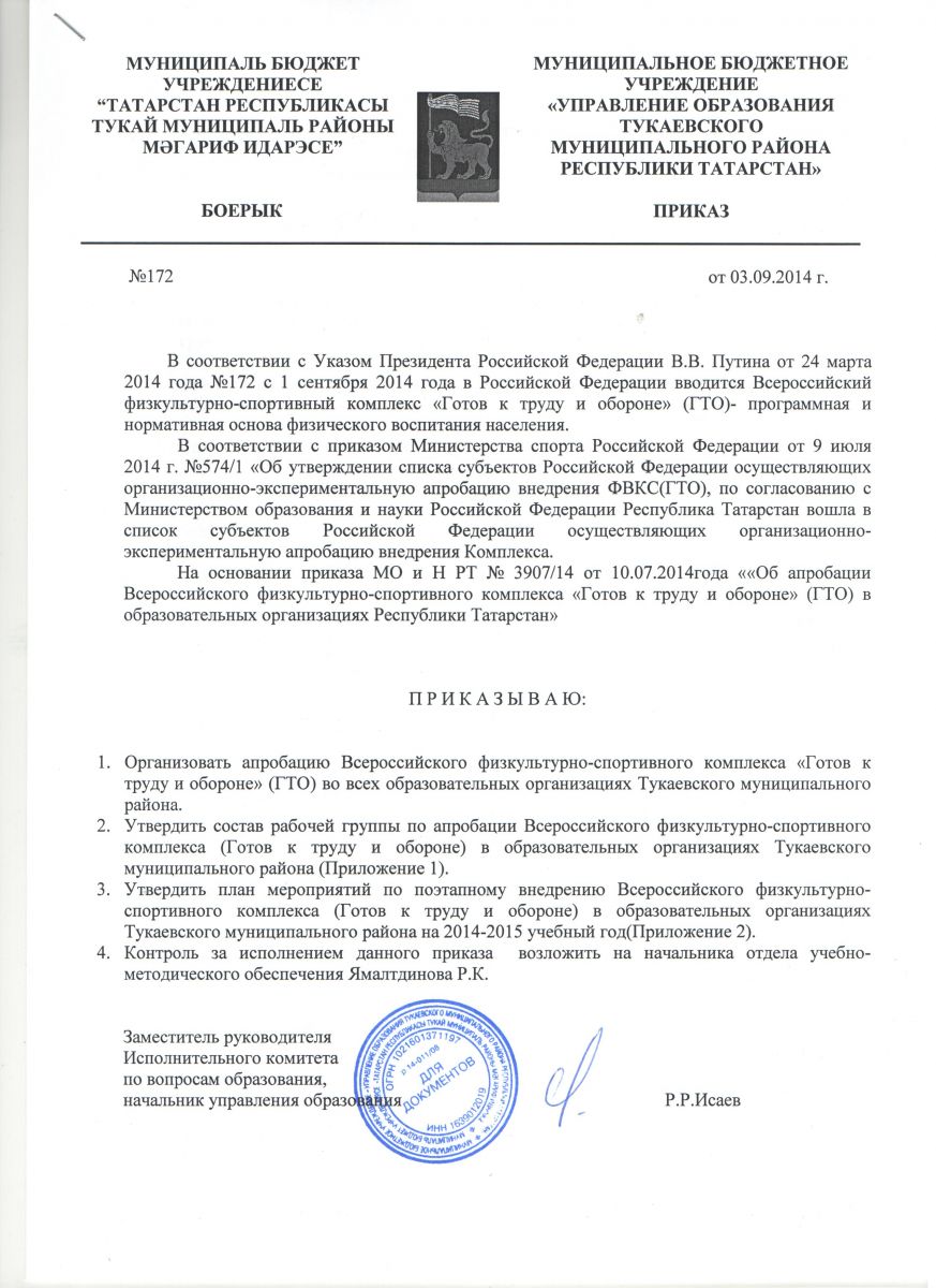Приказ УО Тукаевского муниципального район по регламенту внедрения и апробации ВФСК ГТО