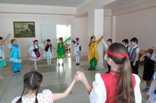 Акция "Культурный хоровод 1 день в национальной одежде". Учащиеся целый день ходили в национальных костюмах, учились и на переменах играли в национальные игры.Им очень понравилось.