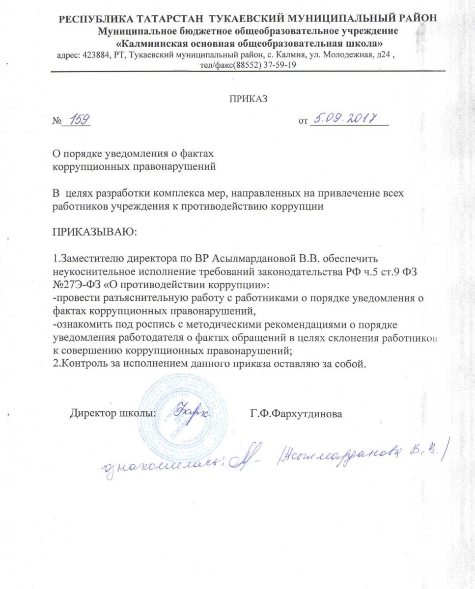 Приказ о порядке уведомления о фактах коррупционных правонарушений