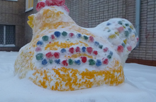 На школьном дворе появились Дед Мороз и Снегурочка, Колобок, Снеговики, Снегомобиль, Единорог, Домик, Крепость, Смурфик, Курочка Ряба, Спанч Боб, Динозавр.