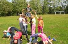 Веселый праздник организован на школьной спортивной площадке. Ребята соревнуются в ловкости, смекалке, скорости.