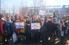 Учащиеся 6-х классов в центре поселка провели акцию против курения. Односельчане, которые поддерживают ребят, должны завязать ленточку не дереве.