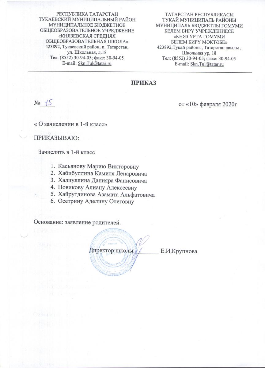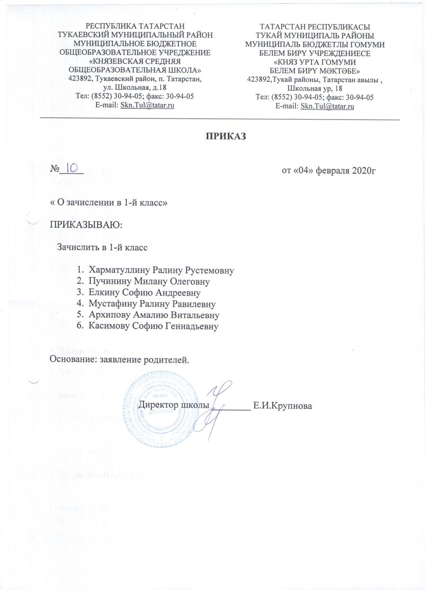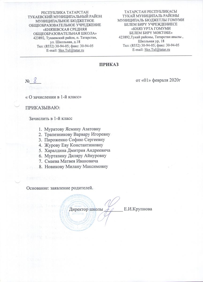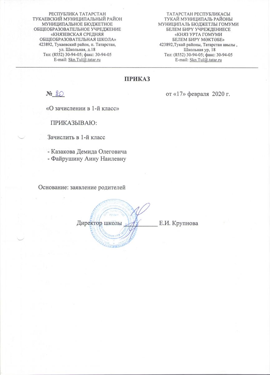 Приказ о зачислении в первый класс на 2020-2021учебный год