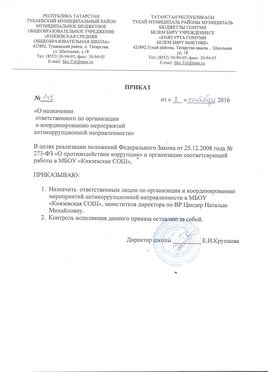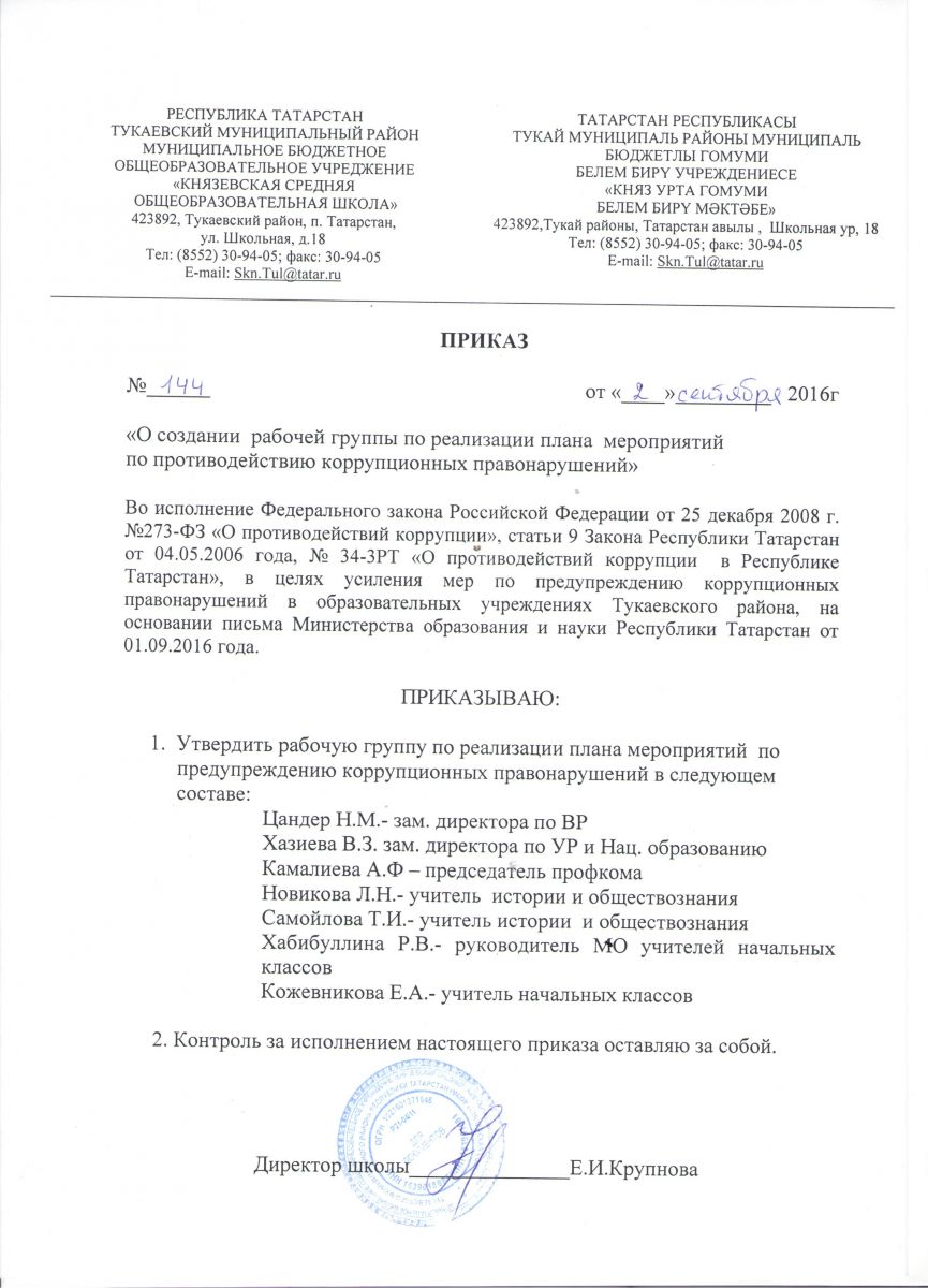 Приказ о создании рабочей группы по реализации плана работы МБОУ «Князевская СОШ» по координации работы по противодействию коррупции